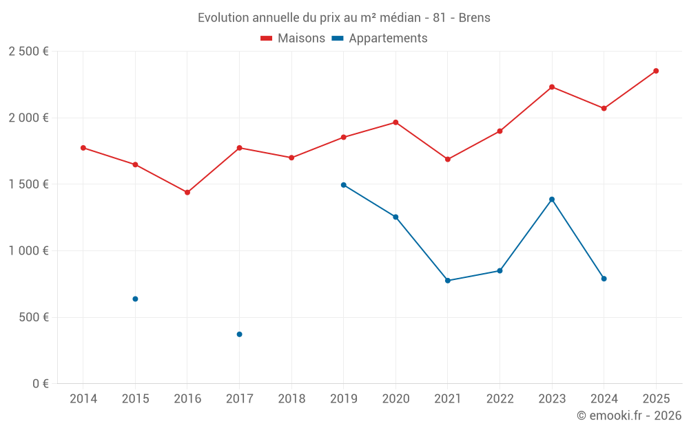 Le prix médian sur les 19 transactions de maisons des 12 derniers mois dans la commune de Brens était de 2 353 € par mètre carré pour une valeur foncière médiane de 259 250 €. Sur cette période 60% des transactions se sont situées entre 1 860 et 2 560 € par mètre carré (du 2ème au 8ème déciles).