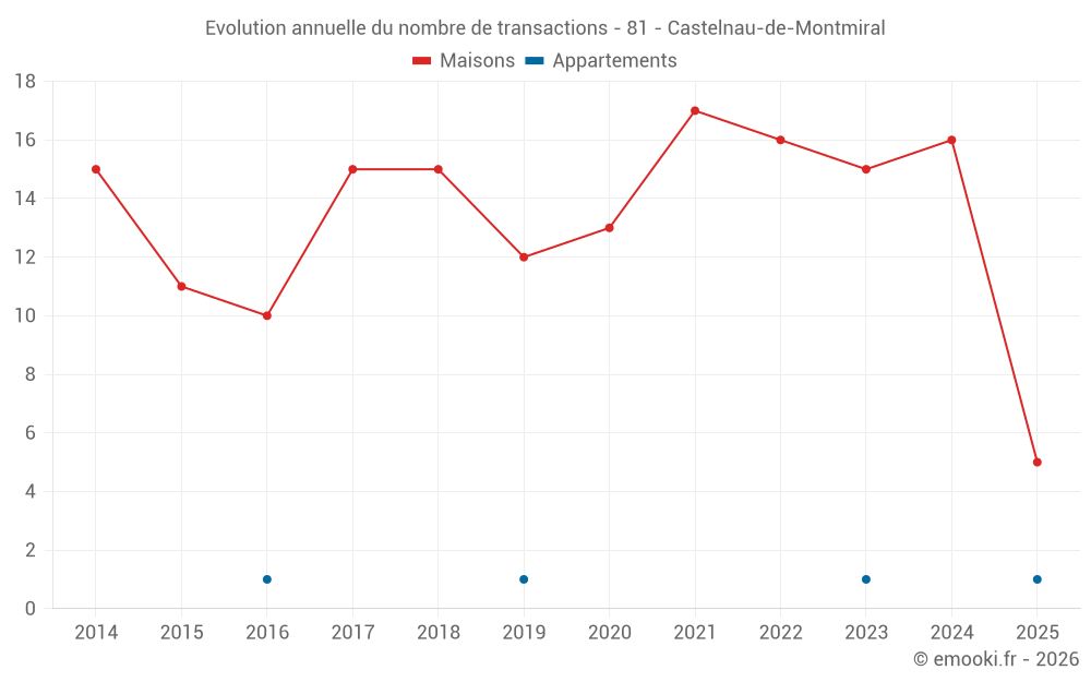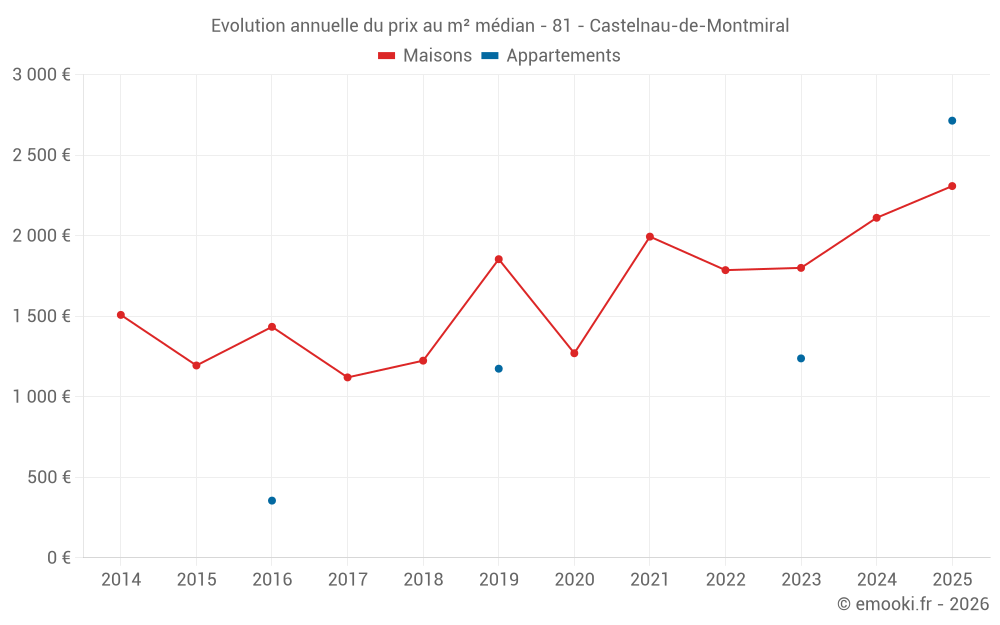 Le prix médian sur les 18 transactions de maisons des 12 derniers mois dans la commune de Castelnau-de-Montmiral était de 2 164 € par mètre carré pour une valeur foncière médiane de 213 100 €. Sur cette période 60% des transactions se sont situées entre 1 199 et 2 936 € par mètre carré (du 2ème au 8ème déciles).