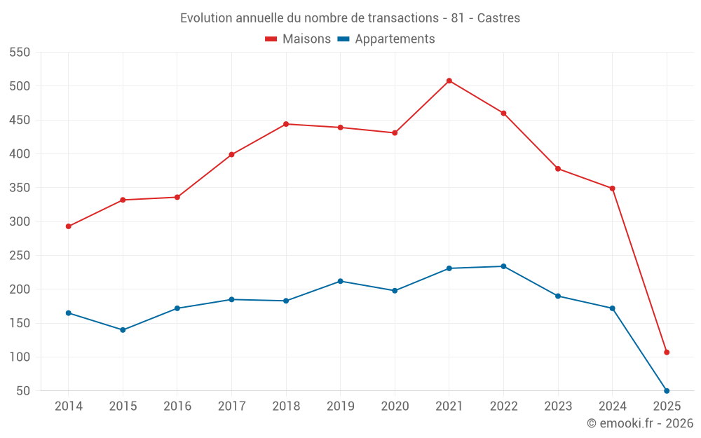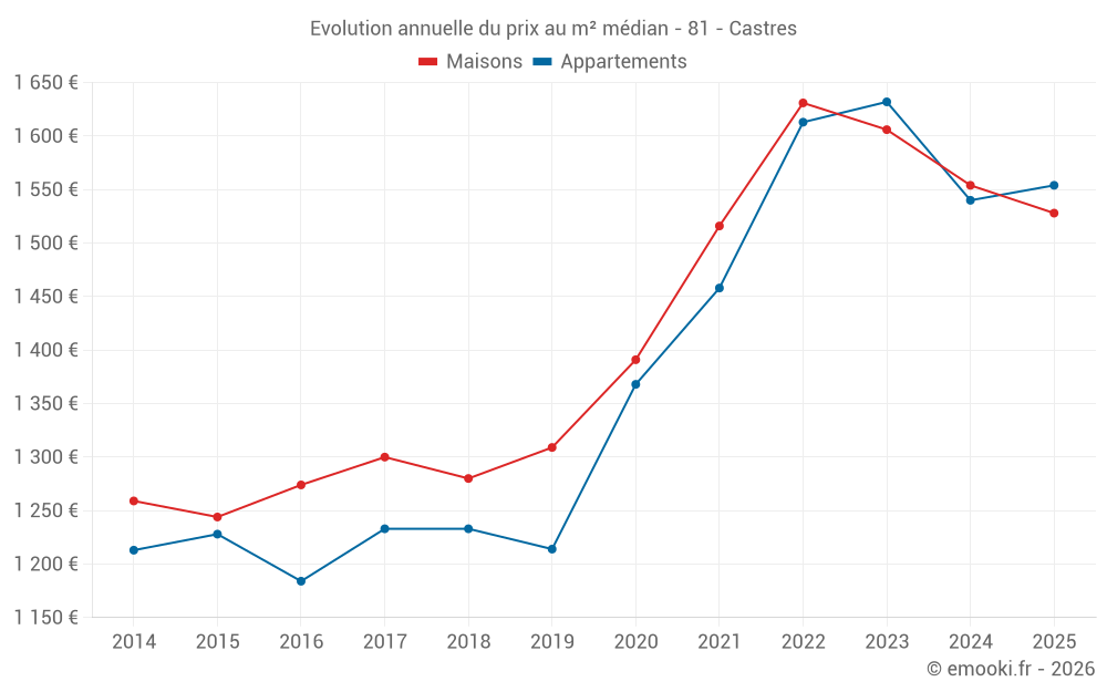 Le prix médian sur les 27 transactions de maisons des 3 derniers mois dans la commune de Castres était de 1 474 € par mètre carré pour une valeur foncière médiane de 140 000 €. Sur cette période 60% des transactions se sont situées entre 986 et 2 080 € par mètre carré (du 2ème au 8ème déciles).