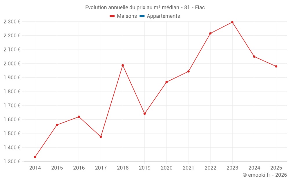 Le prix médian sur les 22 transactions de maisons des 24 derniers mois dans la commune de Fiac était de 2 015 € par mètre carré pour une valeur foncière médiane de 180 500 €. Sur cette période 60% des transactions se sont situées entre 1 487 et 2 819 € par mètre carré (du 2ème au 8ème déciles).