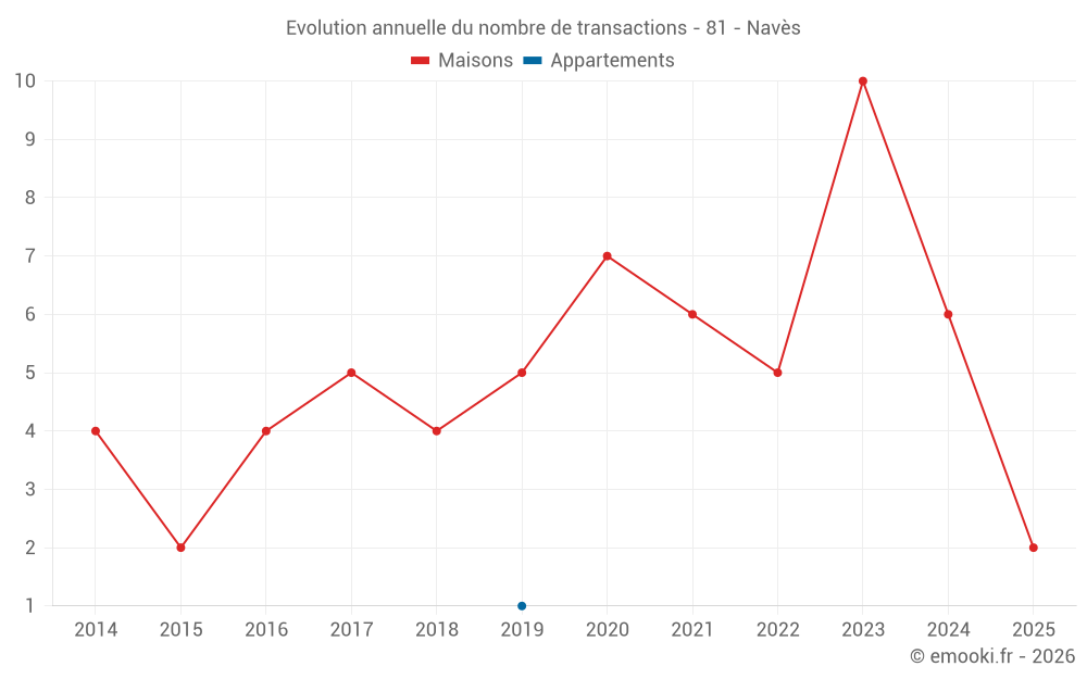 Le prix médian sur les 15 transactions de maisons des 24 derniers mois dans la commune de Navès était de 2 088 € par mètre carré pour une valeur foncière médiane de 200 000 €. Sur cette période 60% des transactions se sont situées entre 1 379 et 2 268 € par mètre carré (du 2ème au 8ème déciles).