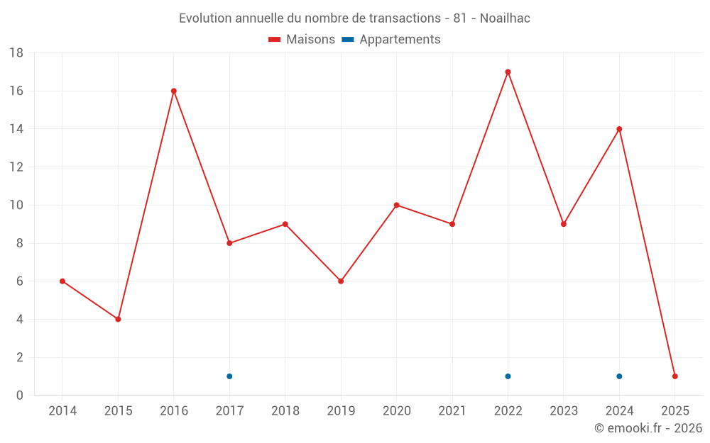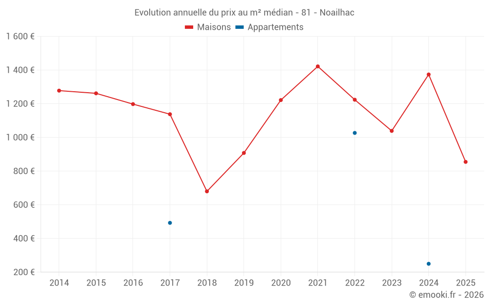 Le prix médian sur les 20 transactions de maisons des 24 derniers mois dans la commune de Noailhac était de 1 224 € par mètre carré pour une valeur foncière médiane de 88 000 €. Sur cette période 60% des transactions se sont situées entre 714 et 1 862 € par mètre carré (du 2ème au 8ème déciles).