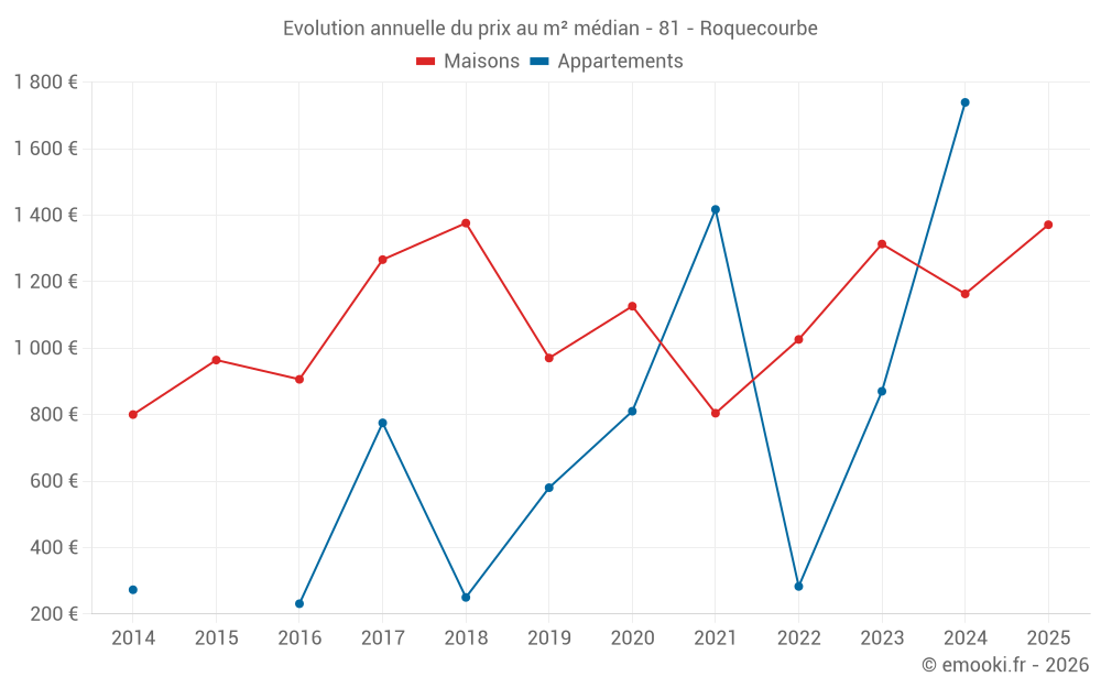 Le prix médian sur les 17 transactions de maisons des 12 derniers mois dans la commune de Roquecourbe était de 1 371 € par mètre carré pour une valeur foncière médiane de 120 000 €. Sur cette période 60% des transactions se sont situées entre 884 et 2 144 € par mètre carré (du 2ème au 8ème déciles).