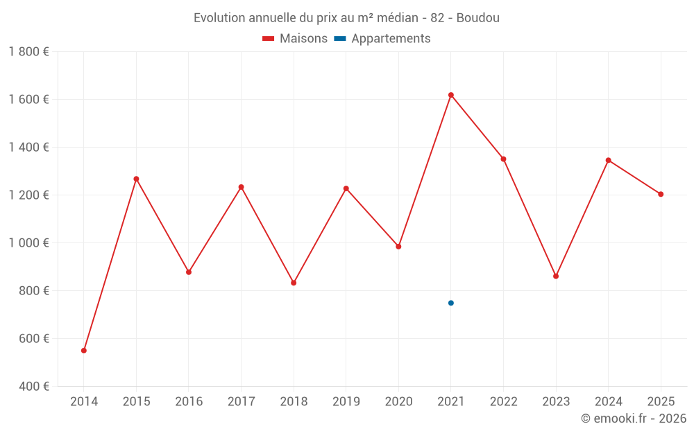Le prix médian sur les 17 transactions de maisons des 24 derniers mois dans la commune de Boudou était de 1 202 € par mètre carré pour une valeur foncière médiane de 138 000 €. Sur cette période 60% des transactions se sont situées entre 683 et 2 022 € par mètre carré (du 2ème au 8ème déciles).