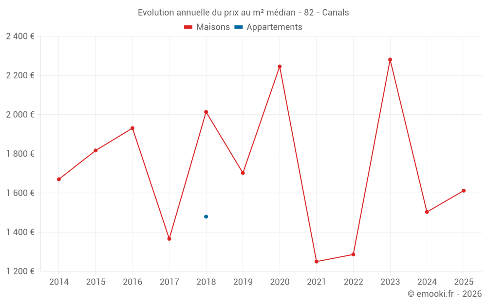 Le prix médian sur les 15 transactions de maisons des 24 derniers mois dans la commune de Canals était de 1 615 € par mètre carré pour une valeur foncière médiane de 172 800 €. Sur cette période 60% des transactions se sont situées entre 1 283 et 2 795 € par mètre carré (du 2ème au 8ème déciles).