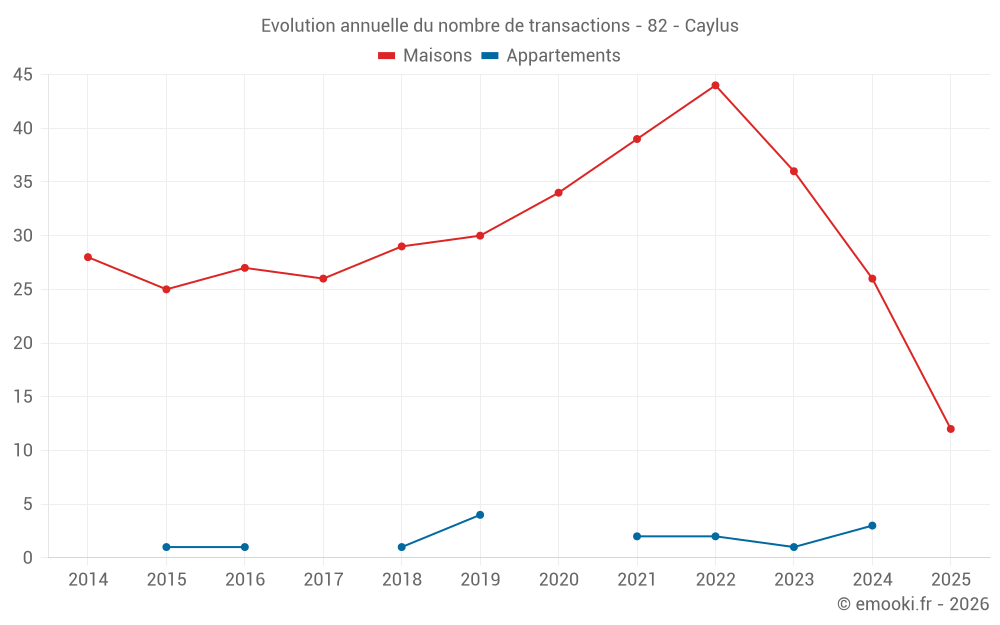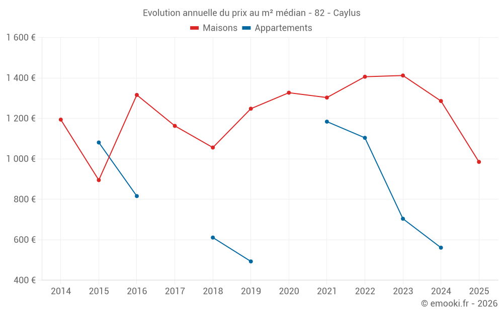 Le prix médian sur les 26 transactions de maisons des 12 derniers mois dans la commune de Caylus était de 1 384 € par mètre carré pour une valeur foncière médiane de 121 810 €. Sur cette période 60% des transactions se sont situées entre 831 et 1 766 € par mètre carré (du 2ème au 8ème déciles).