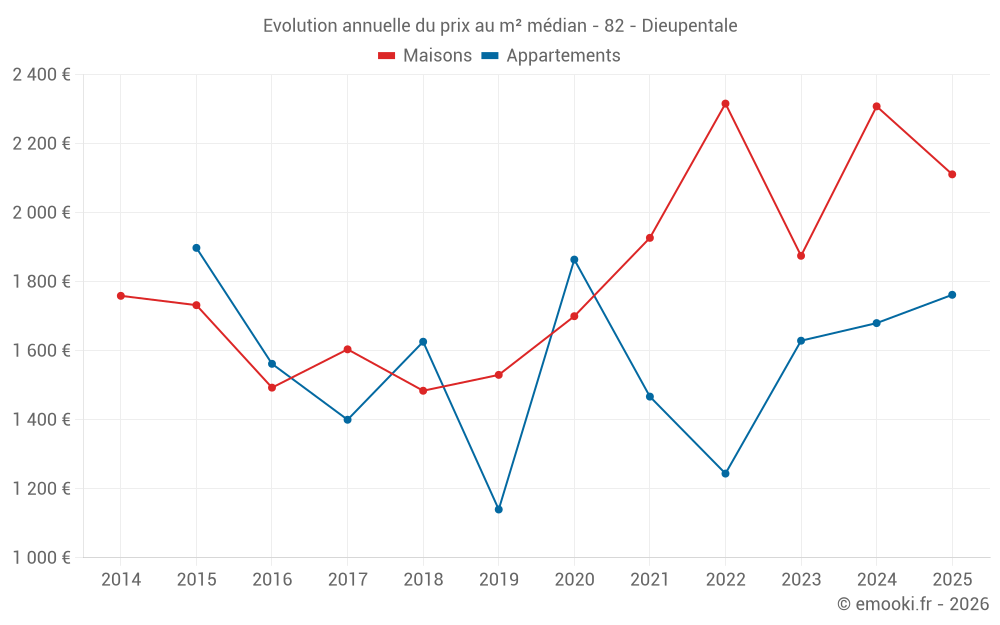 Le prix médian sur les 20 transactions de maisons des 12 derniers mois dans la commune de Dieupentale était de 2 288 € par mètre carré pour une valeur foncière médiane de 231 777 €. Sur cette période 60% des transactions se sont situées entre 1 729 et 2 585 € par mètre carré (du 2ème au 8ème déciles).