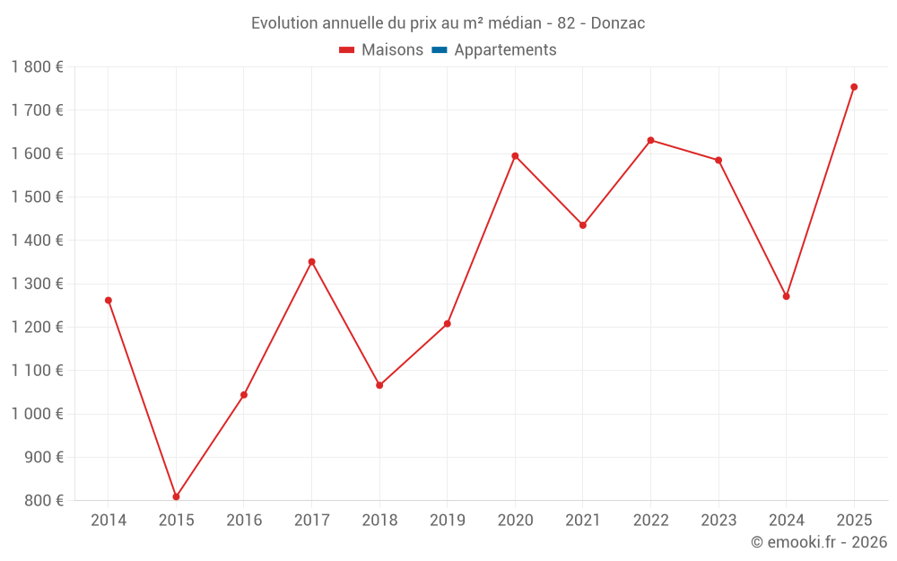 Le prix médian sur les 15 transactions de maisons des 24 derniers mois dans la commune de Donzac était de 1 635 € par mètre carré pour une valeur foncière médiane de 175 800 €. Sur cette période 60% des transactions se sont situées entre 1 034 et 1 821 € par mètre carré (du 2ème au 8ème déciles).