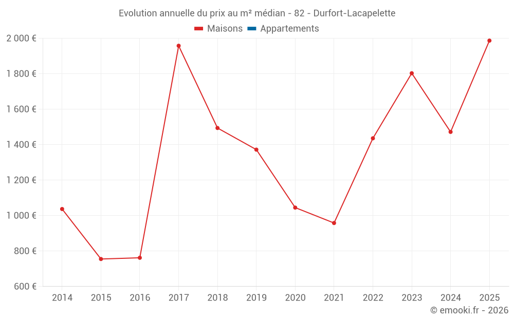 Le prix médian sur les 15 transactions de maisons des 24 derniers mois dans la commune de Durfort-Lacapelette était de 1 472 € par mètre carré pour une valeur foncière médiane de 167 500 €. Sur cette période 60% des transactions se sont situées entre 1 071 et 1 915 € par mètre carré (du 2ème au 8ème déciles).