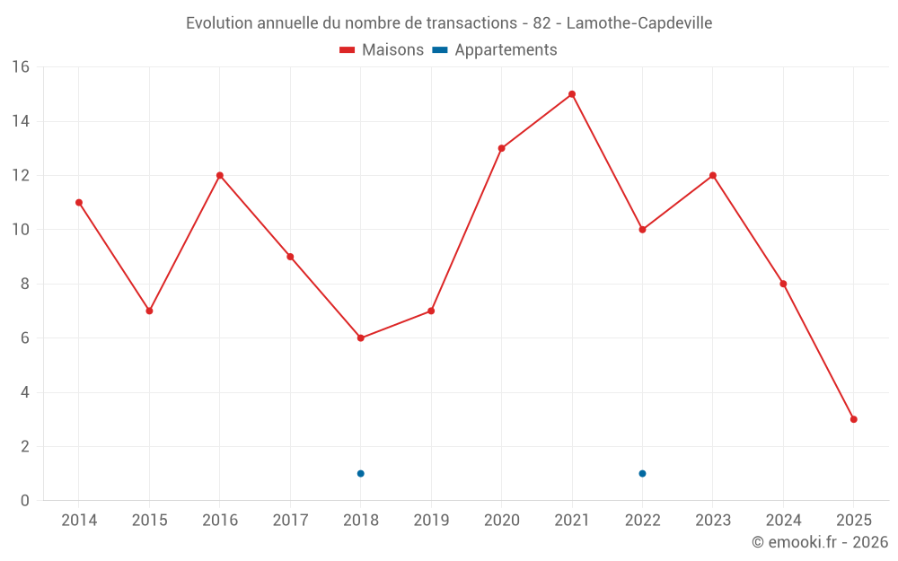 Le prix médian sur les 16 transactions de maisons des 24 derniers mois dans la commune de Lamothe-Capdeville était de 1 662 € par mètre carré pour une valeur foncière médiane de 140 000 €. Sur cette période 60% des transactions se sont situées entre 1 040 et 2 452 € par mètre carré (du 2ème au 8ème déciles).