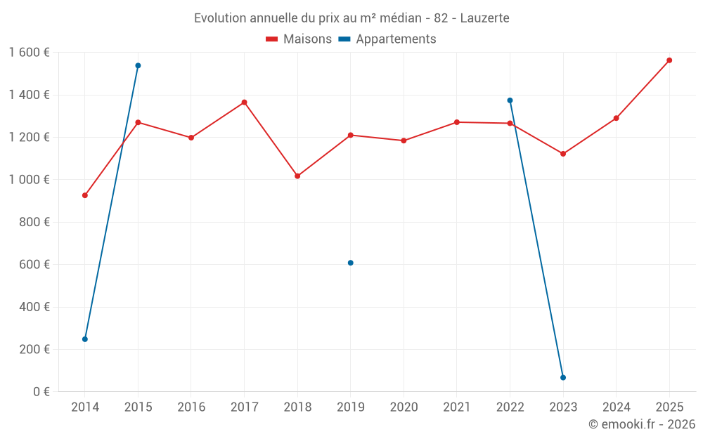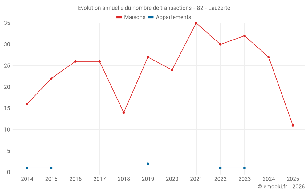 Le prix médian sur les 29 transactions de maisons des 12 derniers mois dans la commune de Lauzerte était de 1 206 € par mètre carré pour une valeur foncière médiane de 135 000 €. Sur cette période 60% des transactions se sont situées entre 730 et 1 917 € par mètre carré (du 2ème au 8ème déciles).