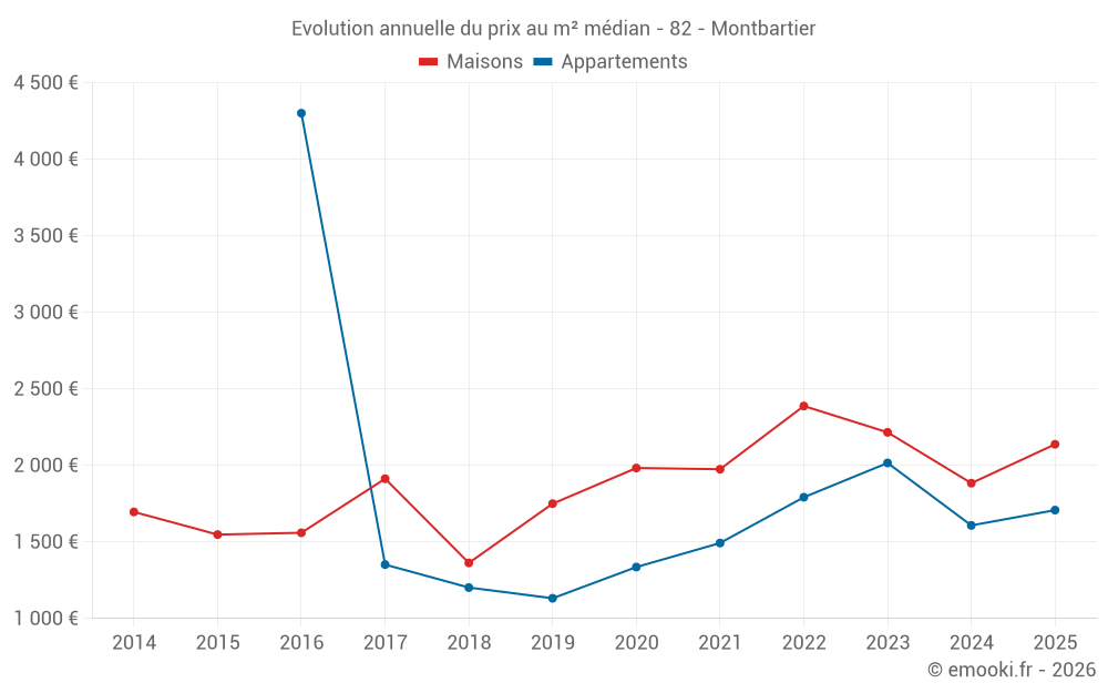 Le prix médian sur les 19 transactions de maisons des 12 derniers mois dans la commune de Montbartier était de 1 938 € par mètre carré pour une valeur foncière médiane de 240 000 €. Sur cette période 60% des transactions se sont situées entre 1 481 et 2 496 € par mètre carré (du 2ème au 8ème déciles).