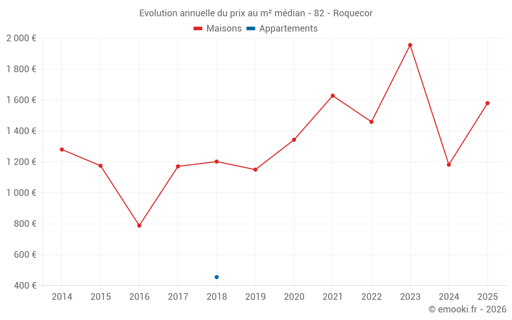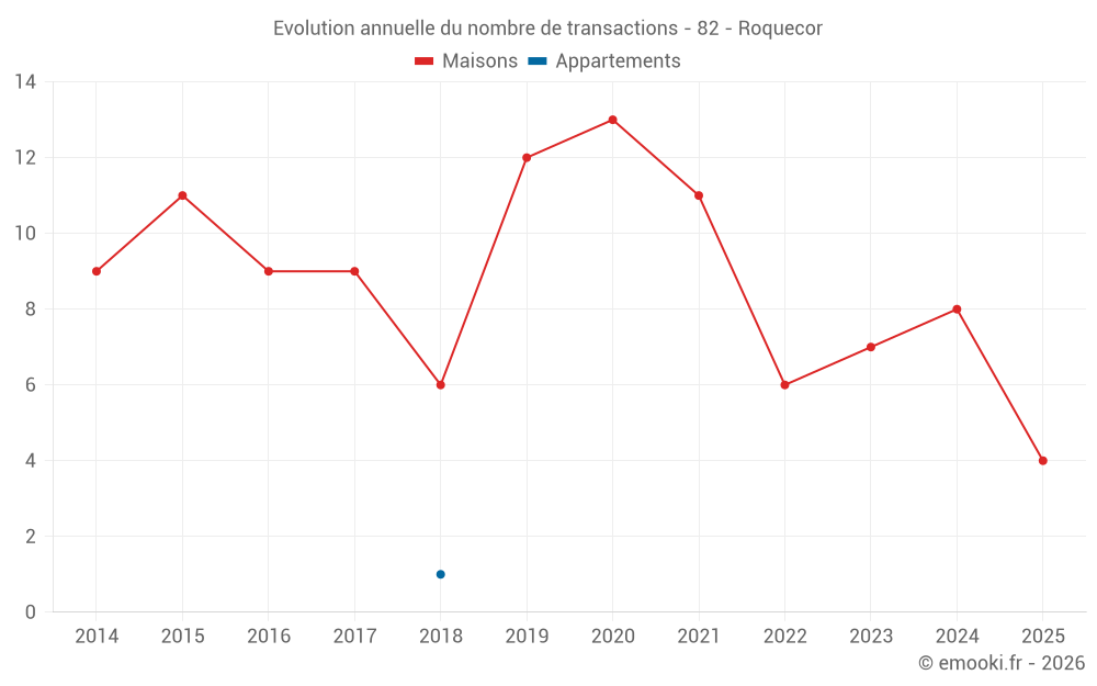 Le prix médian sur les 15 transactions de maisons des 24 derniers mois dans la commune de Roquecor était de 1 286 € par mètre carré pour une valeur foncière médiane de 136 450 €. Sur cette période 60% des transactions se sont situées entre 883 et 1 709 € par mètre carré (du 2ème au 8ème déciles).