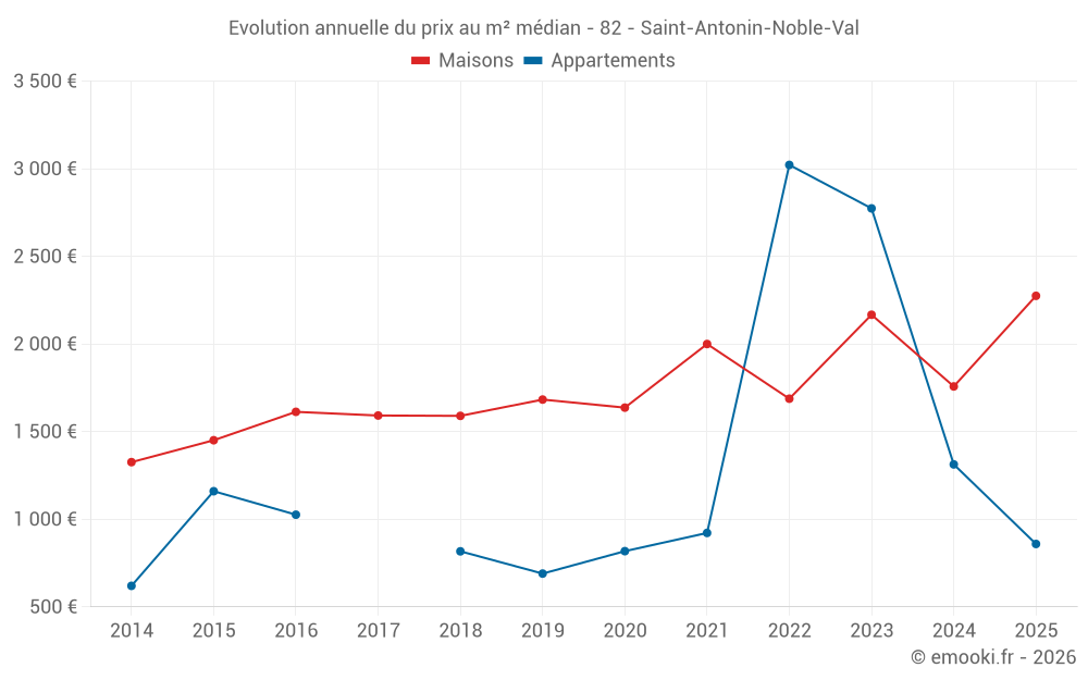 Le prix médian sur les 25 transactions de maisons des 12 derniers mois dans la commune de Saint-Antonin-Noble-Val était de 2 148 € par mètre carré pour une valeur foncière médiane de 247 480 €. Sur cette période 60% des transactions se sont situées entre 1 443 et 2 786 € par mètre carré (du 2ème au 8ème déciles).