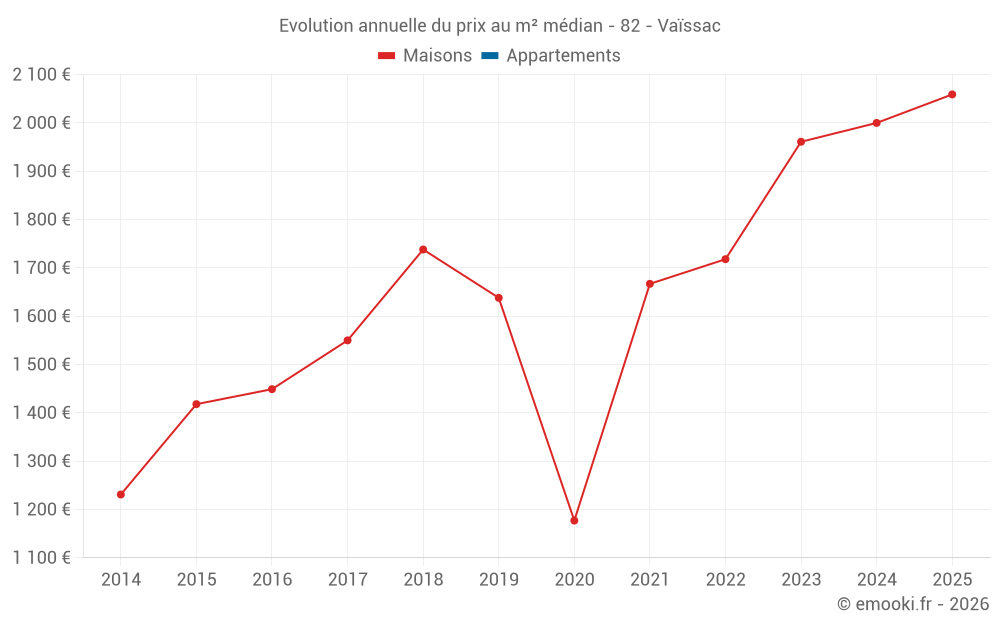 Le prix médian sur les 15 transactions de maisons des 24 derniers mois dans la commune de Vaïssac était de 2 000 € par mètre carré pour une valeur foncière médiane de 228 000 €. Sur cette période 60% des transactions se sont situées entre 1 588 et 2 354 € par mètre carré (du 2ème au 8ème déciles).