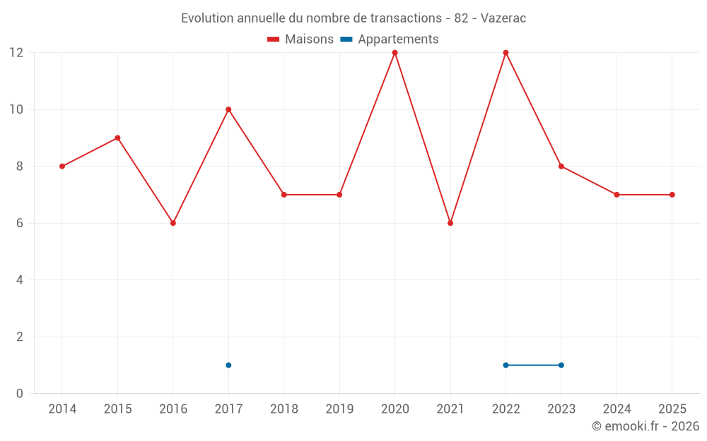 Le prix médian sur les 18 transactions de maisons des 24 derniers mois dans la commune de Vazerac était de 1 322 € par mètre carré pour une valeur foncière médiane de 127 500 €. Sur cette période 60% des transactions se sont situées entre 657 et 1 791 € par mètre carré (du 2ème au 8ème déciles).