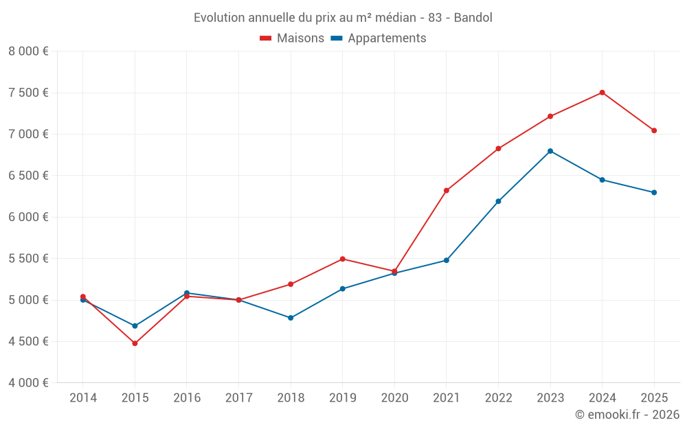 Le prix médian sur les 31 transactions de maisons des 6 derniers mois dans la commune de Bandol était de 7 043 € par mètre carré pour une valeur foncière médiane de 885 000 €. Sur cette période 60% des transactions se sont situées entre 5 455 et 9 048 € par mètre carré (du 2ème au 8ème déciles).