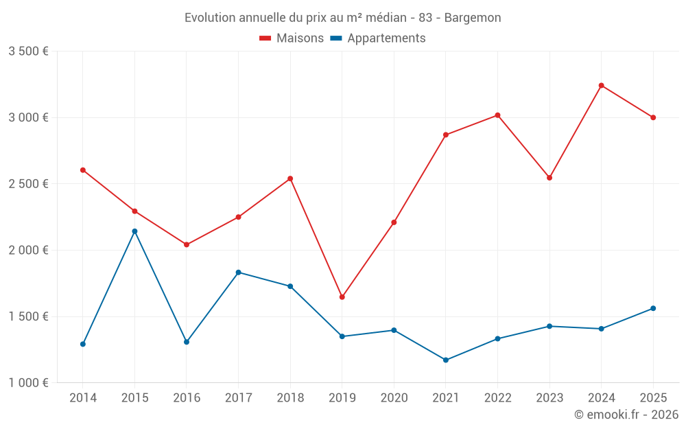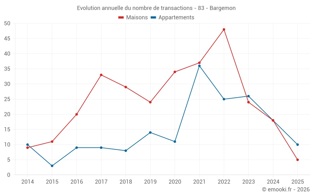 Le prix médian sur les 16 transactions de maisons des 12 derniers mois dans la commune de Bargemon était de 3 060 € par mètre carré pour une valeur foncière médiane de 303 750 €. Sur cette période 60% des transactions se sont situées entre 2 500 et 3 649 € par mètre carré (du 2ème au 8ème déciles).