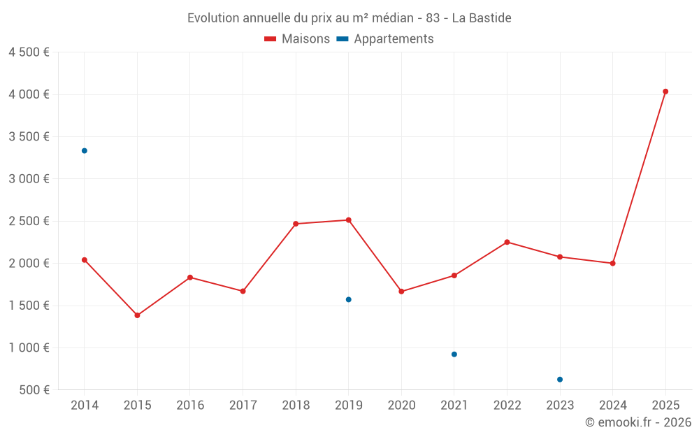 Le prix médian sur les 14 transactions de maisons des 24 derniers mois dans la commune de la Bastide était de 2 204 € par mètre carré pour une valeur foncière médiane de 195 000 €. Sur cette période 60% des transactions se sont situées entre 1 865 et 3 962 € par mètre carré (du 2ème au 8ème déciles).