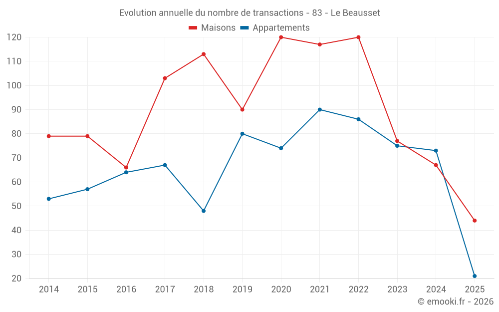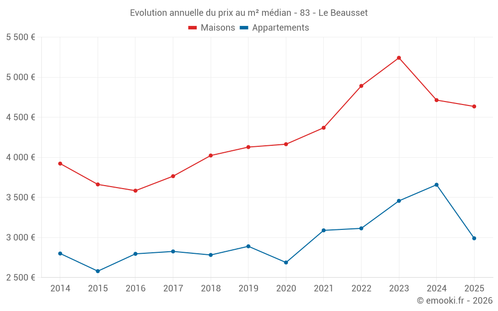 Le prix médian sur les 44 transactions de maisons des 6 derniers mois dans la commune du Beausset était de 4 635 € par mètre carré pour une valeur foncière médiane de 442 500 €. Sur cette période 60% des transactions se sont situées entre 2 888 et 6 321 € par mètre carré (du 2ème au 8ème déciles).
