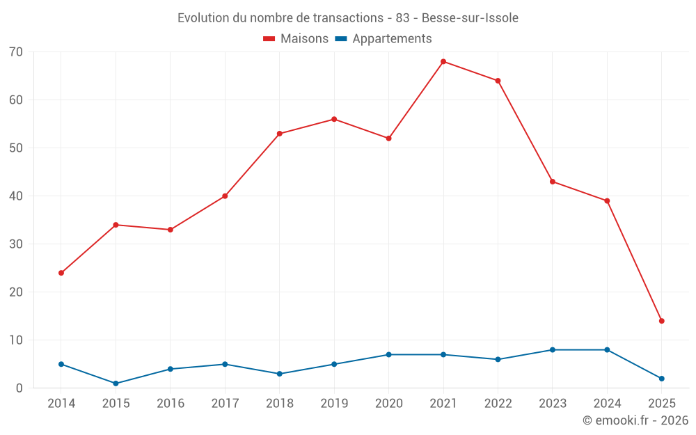 Le prix médian sur les 35 transactions de maisons des 12 derniers mois dans la commune de Besse-sur-Issole était de 2 770 € par mètre carré pour une valeur foncière médiane de 300 000 €. Sur cette période 60% des transactions se sont situées entre 1 790 et 3 746 € par mètre carré (du 2ème au 8ème déciles).