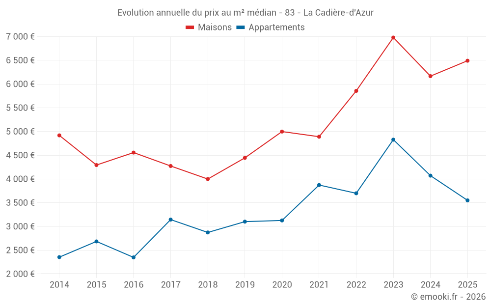 Le prix médian sur les 29 transactions de maisons des 6 derniers mois dans la commune de la Cadière-d'Azur était de 6 493 € par mètre carré pour une valeur foncière médiane de 900 000 €. Sur cette période 60% des transactions se sont situées entre 5 076 et 7 938 € par mètre carré (du 2ème au 8ème déciles).