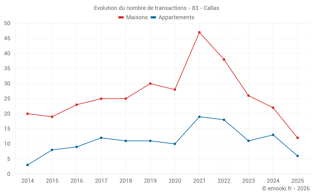 Le prix médian sur les 24 transactions de maisons des 12 derniers mois dans la commune de Callas était de 3 097 € par mètre carré pour une valeur foncière médiane de 334 150 €. Sur cette période 60% des transactions se sont situées entre 2 412 et 3 712 € par mètre carré (du 2ème au 8ème déciles).