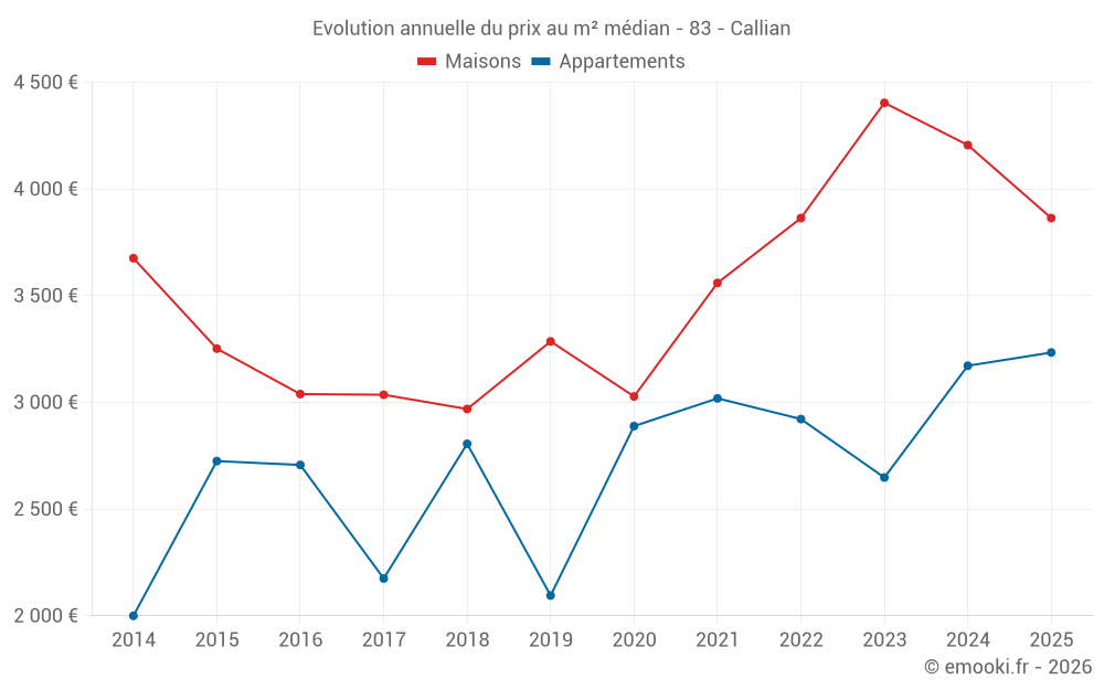 Le prix médian sur les 22 transactions de maisons des 6 derniers mois dans la commune de Callian était de 3 864 € par mètre carré pour une valeur foncière médiane de 390 255 €. Sur cette période 60% des transactions se sont situées entre 2 639 et 4 892 € par mètre carré (du 2ème au 8ème déciles).