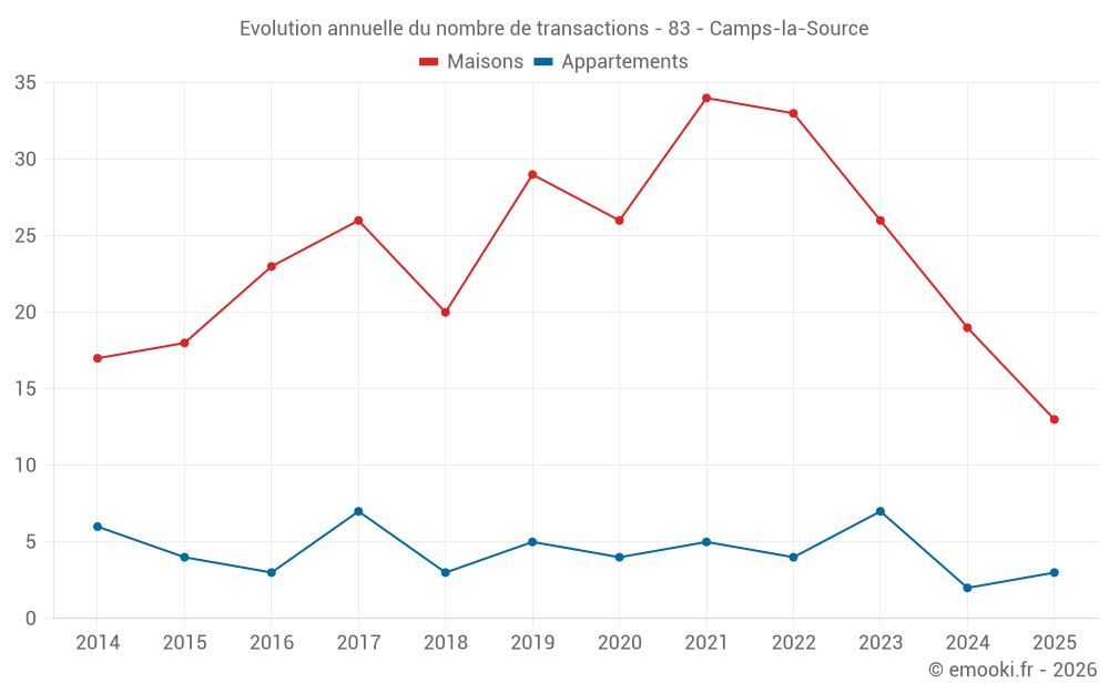 Le prix médian sur les 22 transactions de maisons des 12 derniers mois dans la commune de Camps-la-Source était de 2 954 € par mètre carré pour une valeur foncière médiane de 216 750 €. Sur cette période 60% des transactions se sont situées entre 1 869 et 3 756 € par mètre carré (du 2ème au 8ème déciles).