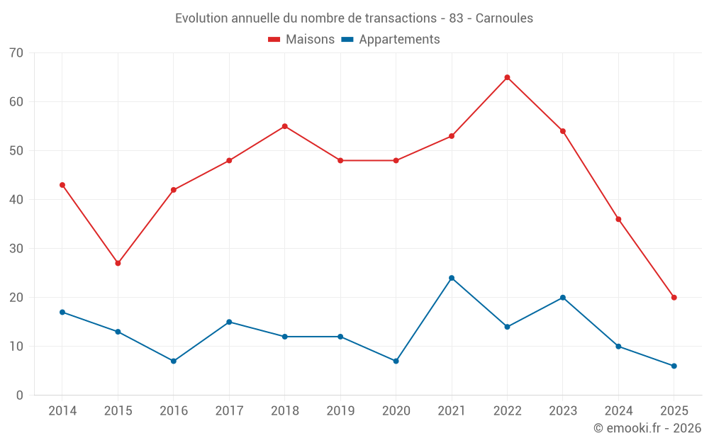 Le prix médian sur les 25 transactions d'appartements des 24 derniers mois dans la commune de Carnoules était de 2 248 € par mètre carré pour une valeur foncière médiane de 129 900 €. Sur cette période 60% des transactions se sont situées entre 1 699 et 2 853 € par mètre carré (du 2ème au 8ème déciles).