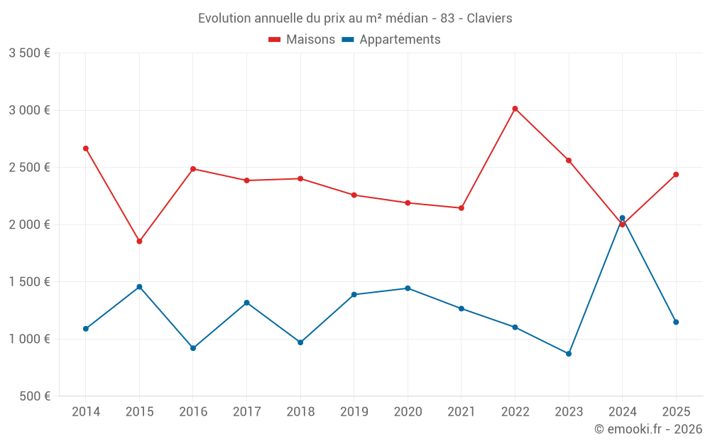 Le prix médian sur les 27 transactions de maisons des 24 derniers mois dans la commune de Claviers était de 2 326 € par mètre carré pour une valeur foncière médiane de 210 000 €. Sur cette période 60% des transactions se sont situées entre 1 411 et 3 797 € par mètre carré (du 2ème au 8ème déciles).