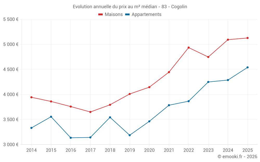 Le prix médian sur les 37 transactions de maisons des 6 derniers mois dans la commune de Cogolin était de 5 128 € par mètre carré pour une valeur foncière médiane de 445 000 €. Sur cette période 60% des transactions se sont situées entre 4 171 et 6 101 € par mètre carré (du 2ème au 8ème déciles).
