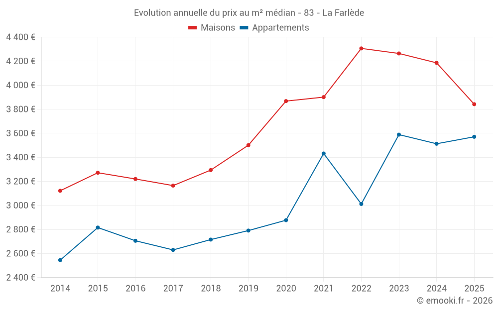 Le prix médian sur les 29 transactions de maisons des 6 derniers mois dans la commune de la Farlède était de 3 842 € par mètre carré pour une valeur foncière médiane de 370 000 €. Sur cette période 60% des transactions se sont situées entre 2 764 et 4 450 € par mètre carré (du 2ème au 8ème déciles).