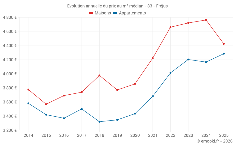 Le prix médian sur les 52 transactions de maisons des 3 derniers mois dans la commune de Fréjus était de 4 530 € par mètre carré pour une valeur foncière médiane de 509 550 €. Sur cette période 60% des transactions se sont situées entre 3 640 et 5 466 € par mètre carré (du 2ème au 8ème déciles).