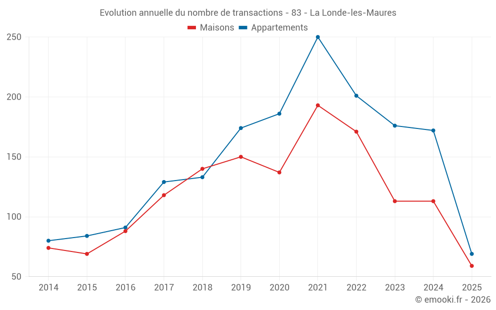 Le prix médian sur les 25 transactions de maisons des 3 derniers mois dans la commune de la Londe-les-Maures était de 5 475 € par mètre carré pour une valeur foncière médiane de 470 450 €. Sur cette période 60% des transactions se sont situées entre 4 061 et 7 026 € par mètre carré (du 2ème au 8ème déciles).