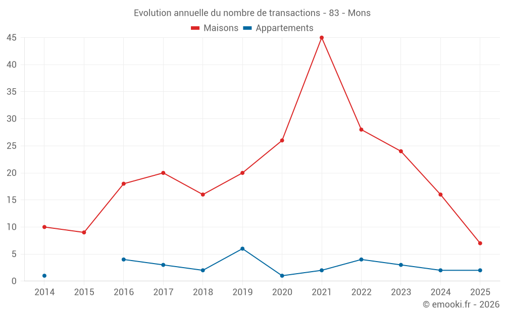 Le prix médian sur les 18 transactions de maisons des 12 derniers mois dans la commune de Mons était de 3 506 € par mètre carré pour une valeur foncière médiane de 352 500 €. Sur cette période 60% des transactions se sont situées entre 2 449 et 4 378 € par mètre carré (du 2ème au 8ème déciles).