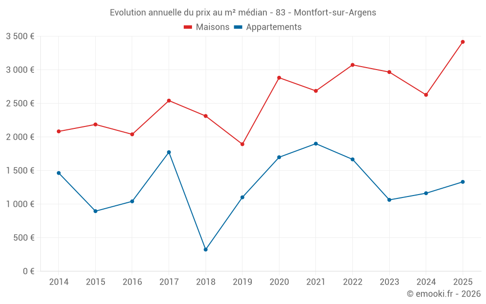 Le prix médian sur les 31 transactions de maisons des 24 derniers mois dans la commune de Montfort-sur-Argens était de 3 105 € par mètre carré pour une valeur foncière médiane de 230 000 €. Sur cette période 60% des transactions se sont situées entre 1 698 et 4 019 € par mètre carré (du 2ème au 8ème déciles).
