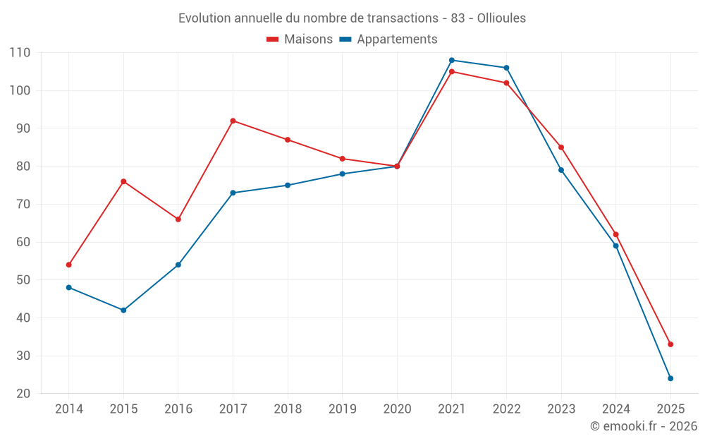 Le prix médian sur les 23 transactions de maisons des 3 derniers mois dans la commune d'Ollioules était de 4 883 € par mètre carré pour une valeur foncière médiane de 460 000 €. Sur cette période 60% des transactions se sont situées entre 4 003 et 6 656 € par mètre carré (du 2ème au 8ème déciles).