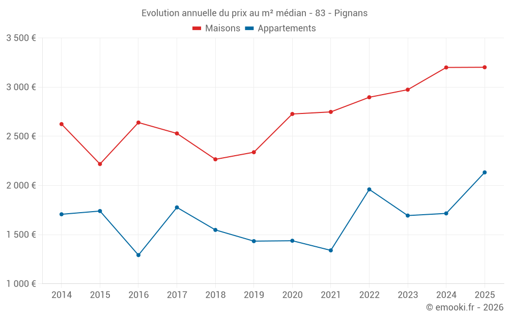 Le prix médian sur les 34 transactions de maisons des 6 derniers mois dans la commune de Pignans était de 3 202 € par mètre carré pour une valeur foncière médiane de 261 750 €. Sur cette période 60% des transactions se sont situées entre 1 845 et 4 196 € par mètre carré (du 2ème au 8ème déciles).