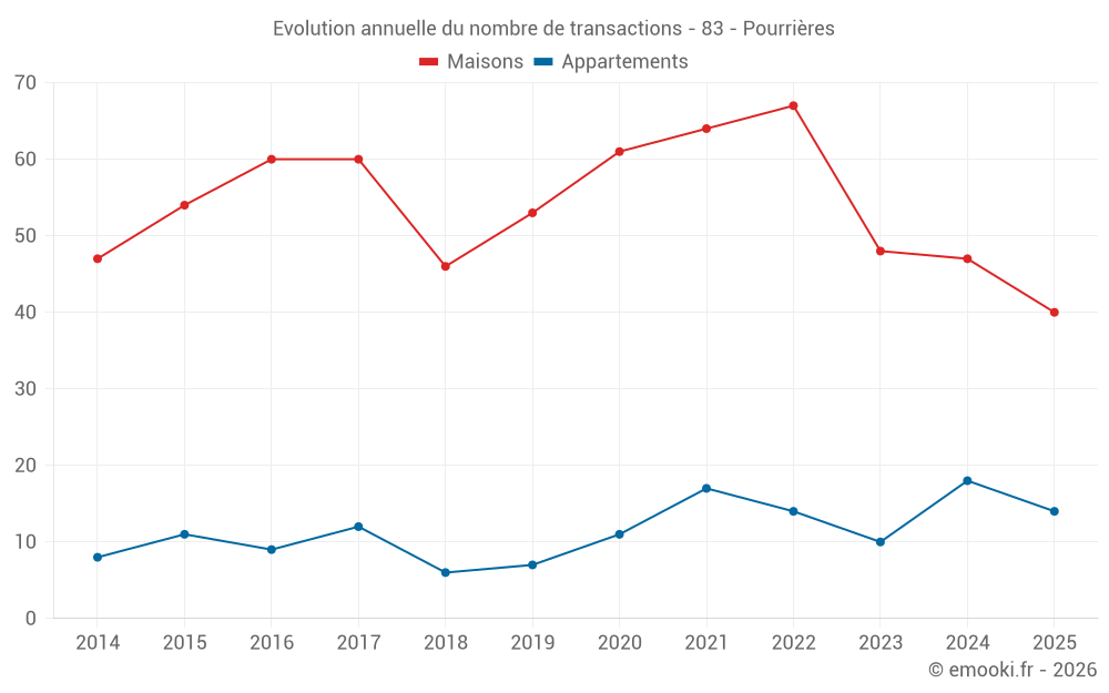 Le prix médian sur les 23 transactions de maisons des 6 derniers mois dans la commune de Pourrières était de 4 204 € par mètre carré pour une valeur foncière médiane de 390 800 €. Sur cette période 60% des transactions se sont situées entre 2 966 et 5 460 € par mètre carré (du 2ème au 8ème déciles).