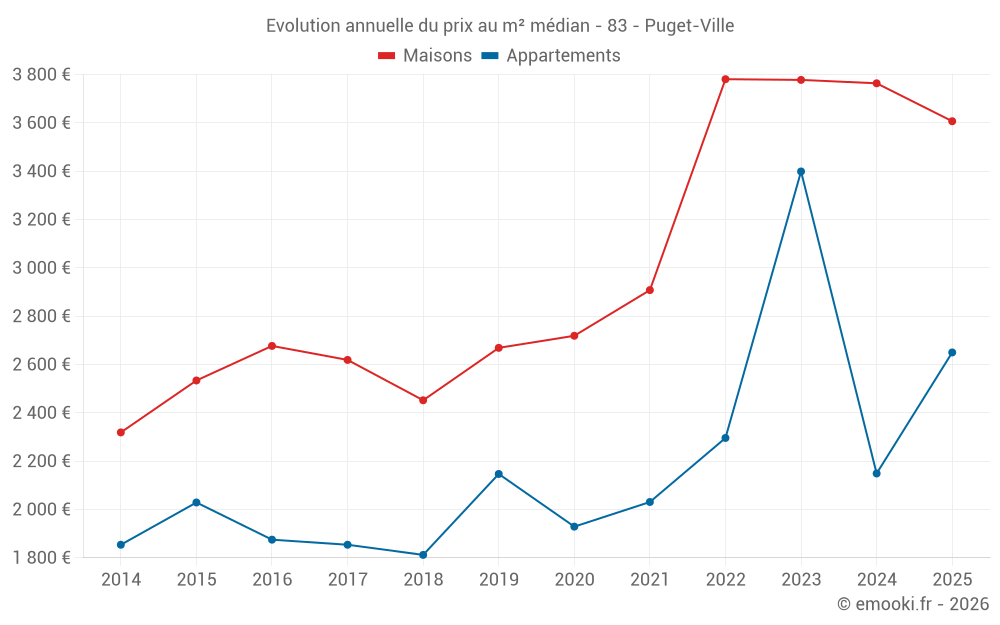Le prix médian sur les 36 transactions de maisons des 12 derniers mois dans la commune de Puget-Ville était de 3 378 € par mètre carré pour une valeur foncière médiane de 309 125 €. Sur cette période 60% des transactions se sont situées entre 2 492 et 4 311 € par mètre carré (du 2ème au 8ème déciles).
