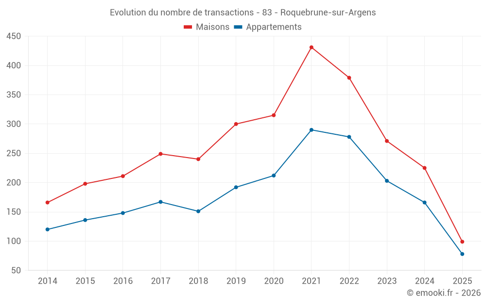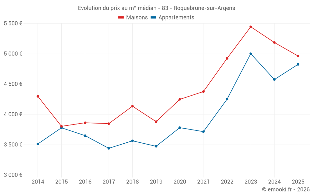 Le prix médian sur les 41 transactions de maisons des 3 derniers mois dans la commune de Roquebrune-sur-Argens était de 4 719 € par mètre carré pour une valeur foncière médiane de 540 000 €. Sur cette période 60% des transactions se sont situées entre 3 924 et 6 750 € par mètre carré (du 2ème au 8ème déciles).