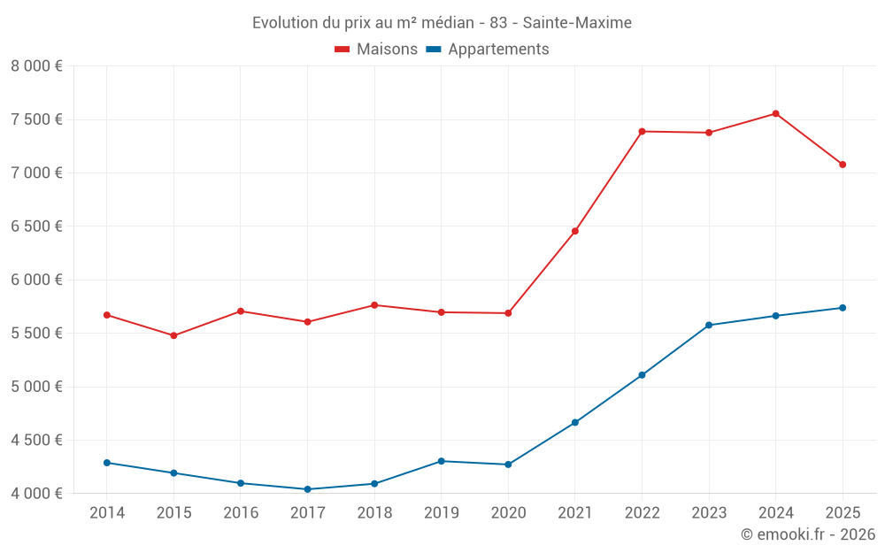 Le prix médian sur les 33 transactions de maisons des 3 derniers mois dans la commune de Sainte-Maxime était de 7 014 € par mètre carré pour une valeur foncière médiane de 780 000 €. Sur cette période 60% des transactions se sont situées entre 5 262 et 9 283 € par mètre carré (du 2ème au 8ème déciles).