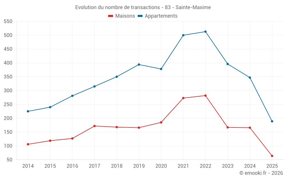 Le prix médian sur les 99 transactions d'appartements des 3 derniers mois dans la commune de Sainte-Maxime était de 5 871 € par mètre carré pour une valeur foncière médiane de 197 000 €. Sur cette période 60% des transactions se sont situées entre 4 405 et 7 655 € par mètre carré (du 2ème au 8ème déciles).