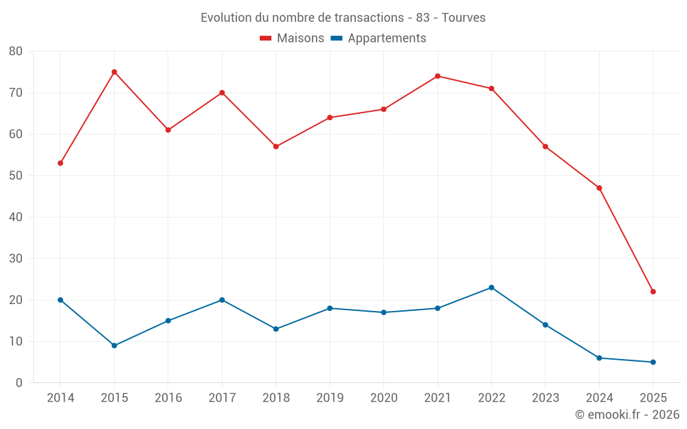 Le prix médian sur les 22 transactions de maisons des 6 derniers mois dans la commune de Tourves était de 3 716 € par mètre carré pour une valeur foncière médiane de 341 375 €. Sur cette période 60% des transactions se sont situées entre 2 146 et 4 400 € par mètre carré (du 2ème au 8ème déciles).