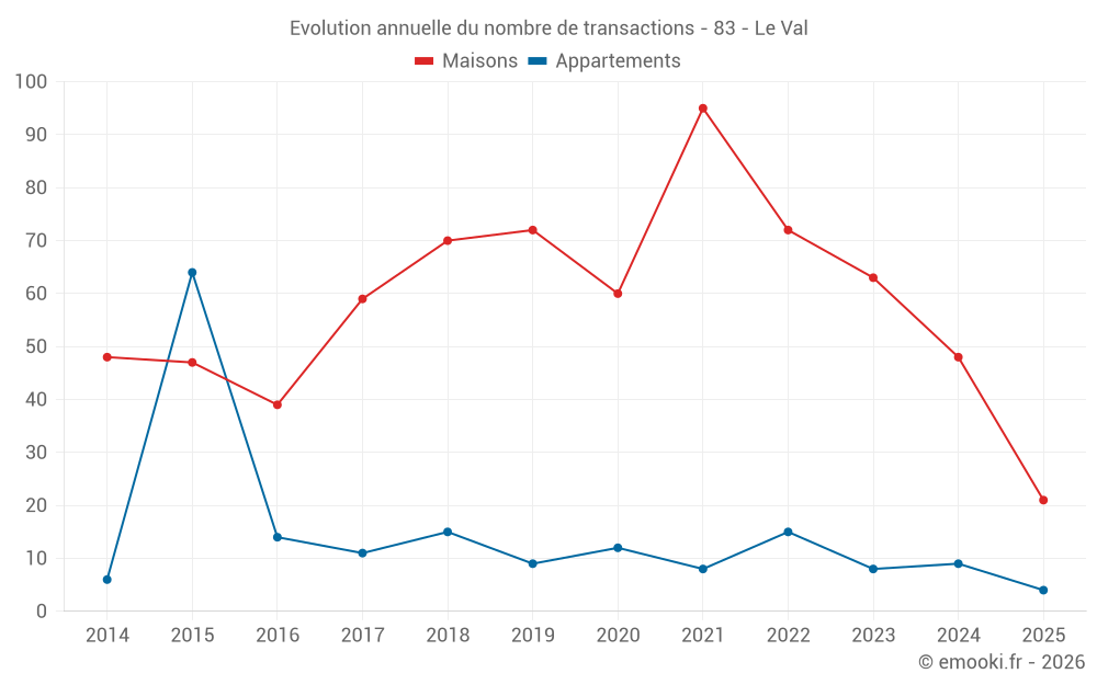 Le prix médian sur les 21 transactions de maisons des 6 derniers mois dans la commune du Val était de 2 987 € par mètre carré pour une valeur foncière médiane de 282 735 €. Sur cette période 60% des transactions se sont situées entre 2 381 et 3 465 € par mètre carré (du 2ème au 8ème déciles).