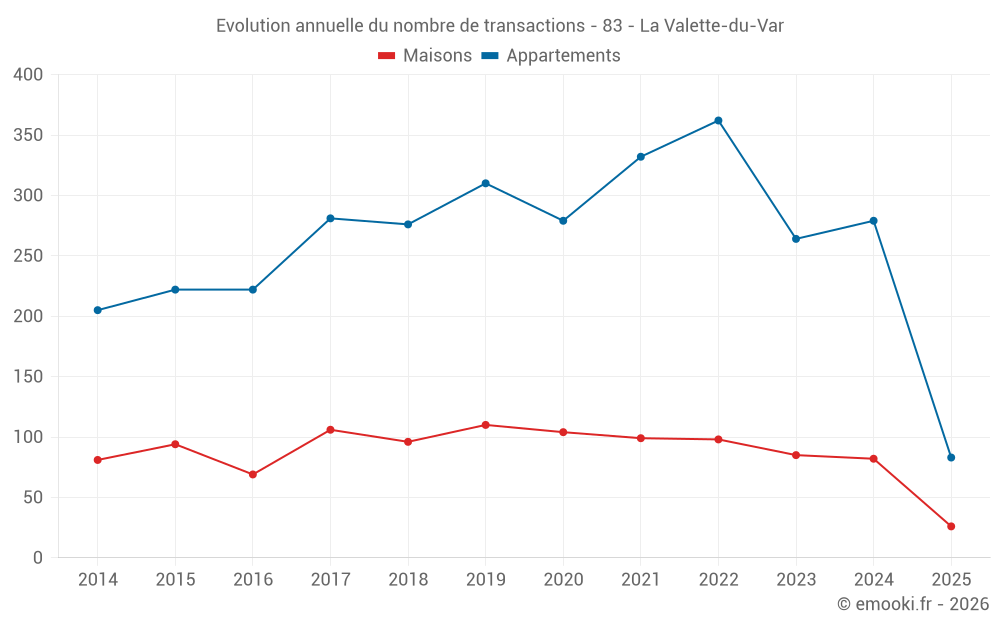 Le prix médian sur les 28 transactions d'appartements des 3 derniers mois dans la commune de la Valette-du-Var était de 2 806 € par mètre carré pour une valeur foncière médiane de 197 165 €. Sur cette période 60% des transactions se sont situées entre 2 403 et 3 860 € par mètre carré (du 2ème au 8ème déciles).