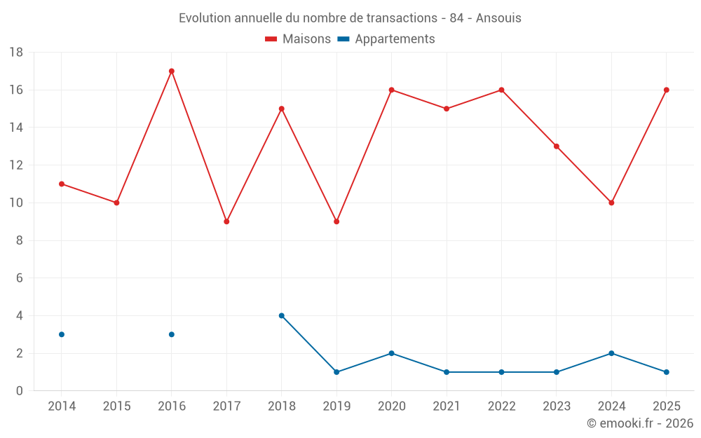 Le prix médian sur les 16 transactions de maisons des 12 derniers mois dans la commune d'Ansouis était de 3 872 € par mètre carré pour une valeur foncière médiane de 461 715 €. Sur cette période 60% des transactions se sont situées entre 2 847 et 5 203 € par mètre carré (du 2ème au 8ème déciles).
