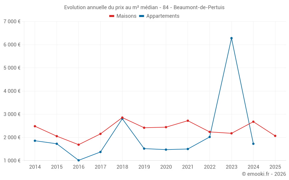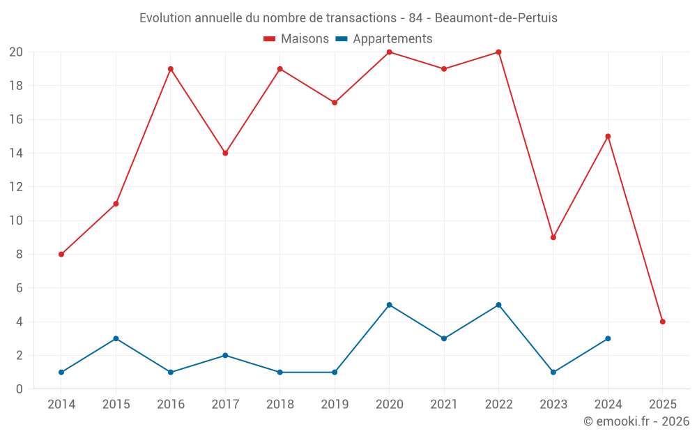 Le prix médian sur les 25 transactions de maisons des 24 derniers mois dans la commune de Beaumont-de-Pertuis était de 2 603 € par mètre carré pour une valeur foncière médiane de 200 000 €. Sur cette période 60% des transactions se sont situées entre 1 486 et 3 241 € par mètre carré (du 2ème au 8ème déciles).