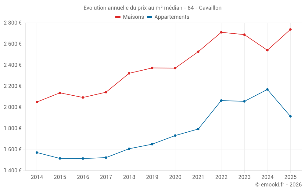 Le prix médian sur les 36 transactions de maisons des 3 derniers mois dans la commune de Cavaillon était de 2 846 € par mètre carré pour une valeur foncière médiane de 248 250 €. Sur cette période 60% des transactions se sont situées entre 2 109 et 3 692 € par mètre carré (du 2ème au 8ème déciles).